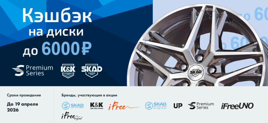 Получите кэшбэк до 6 000 рублей при регистрации чека на покупку от 4-х дисков одного артикула из числа брендов iFree, iFreeUNO, iFreeOriginal,WUP, SKAD, SKAD Original, K&K или Premium Serie с 01.03.2026 по 19.04.2026