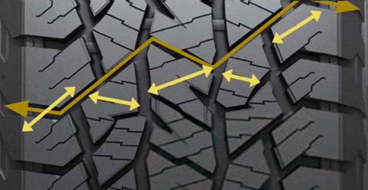 Выступающие плечевые грунтозацепы, расположенные в соотношении два к одному, обеспечивают дополнительное сцепление на бездорожье.