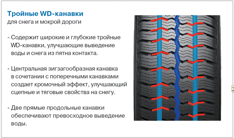 Протектор RY61 оснащен рисунком, разработанным по технологии Triple WD Groove: зигзагообразная канавка в центральной части протекторного рисунка повышает тягу на снегу, а две радиальные канавки отводят воду во время движения по мокрой трассе. Ламели, расположенные в плечевой зоне, оптимизируют сцепление на снежной поверхности, а крупные блоки в центральной части протектора повышают эффективность управления в любую погоду. Полимеры в резиновой смеси повышают стойкость к износу, улучшают сцепление и снижают сопротивление качению.